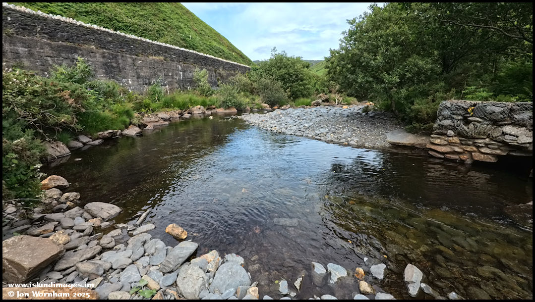 The Sulby River turns through almost 90 degrees at this spot, with the road running above it on a high retaining wall.