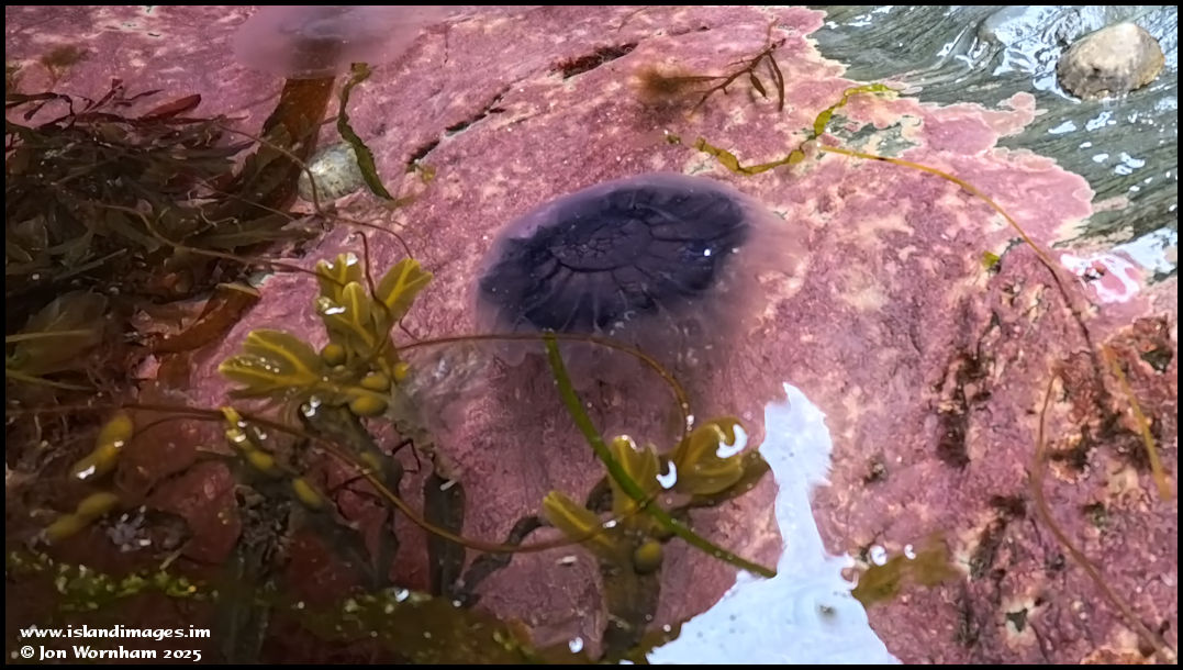 A larger one of the lovely blue jellyfish, nicely set off against the pink rocks in the cave.