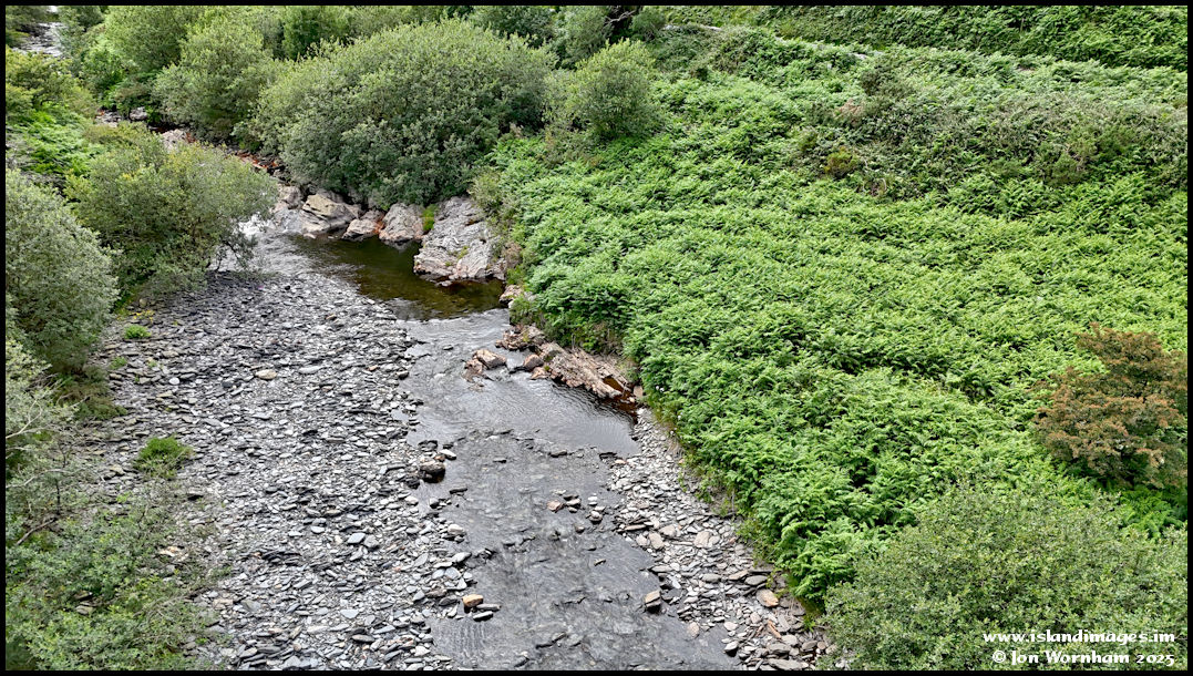 Dropping down to a low level over the river.  The glen road can be seen at top right, the newly published IOM 'Wild Guide' suggests that there is a path down from it, maybe so, but the chest high bracken has hidden it now!