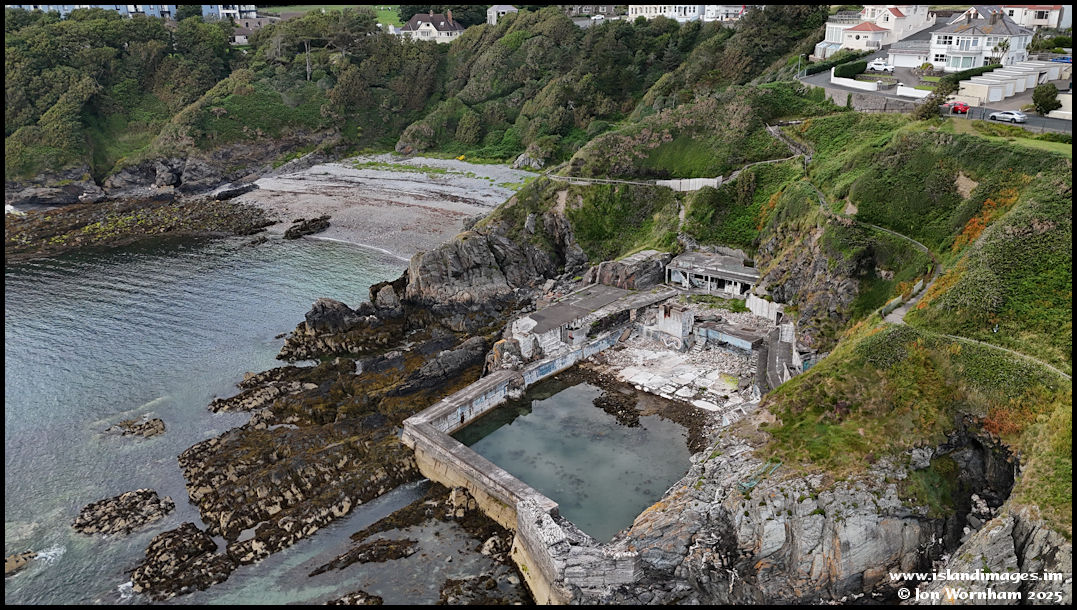 Looking down on the crumbling remains of the old open air sea water swimming pool. These were quite a feature many years ago, with others at Peel, Ramsey and Douglas.