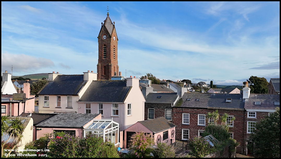 Moving on to my second flying location, which is going to be a static one as it's just a little green area in the middle of town, Castle St Gardens. This is the clock tower of the former St Peter's Church, just after take-off.