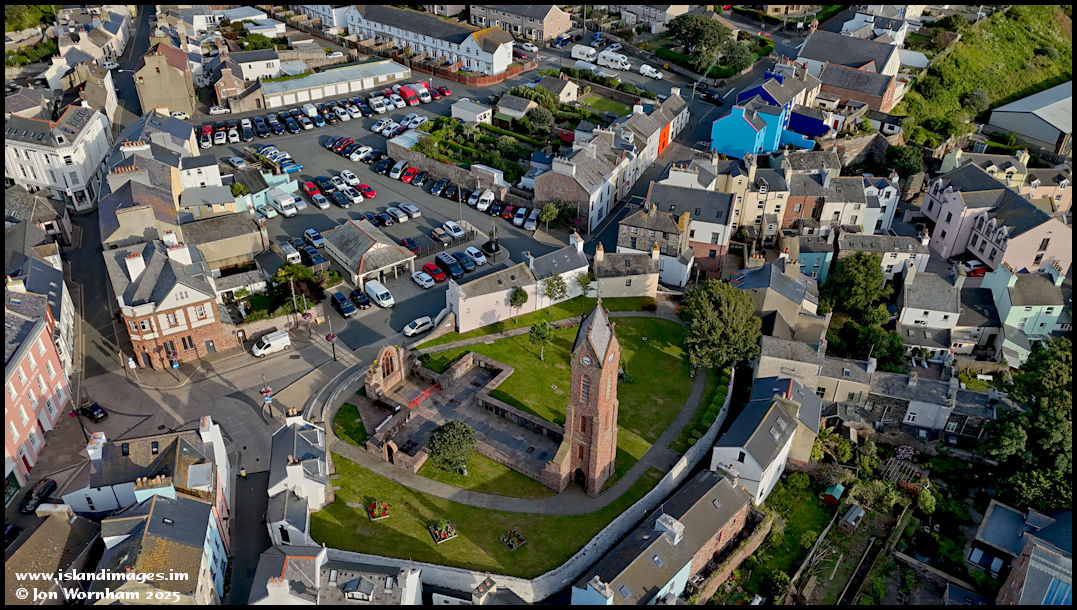 Climbing higher reveals the shape of the former church. Probably constructed around 1550 but rebuilt at least twice, it was replaced by the 'new' St German's Cathedral in 1884 but continued in other uses until a fire in 1958, after which it was demolished.