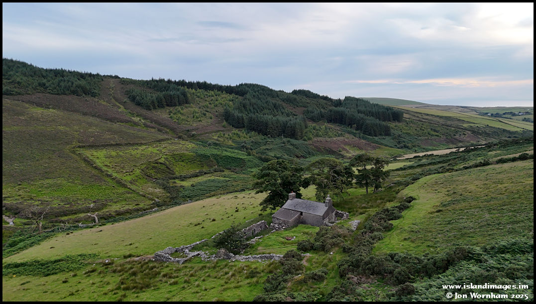 Flying closer to the old farmhouse reveals an intact roof and the remains of the horse powered mill behind the cottage.