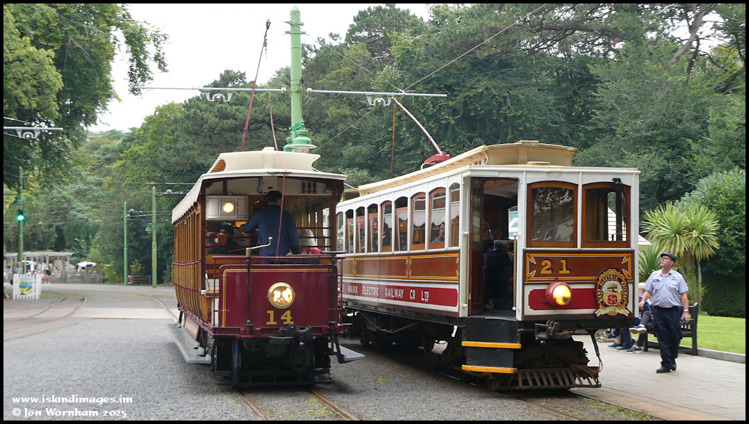 Manx Electric Railway Cars No 14 and 21 in Laxey Station. As part of the Transport Festival, No 14 is operating a shuttle service between Laxey And Groudle.