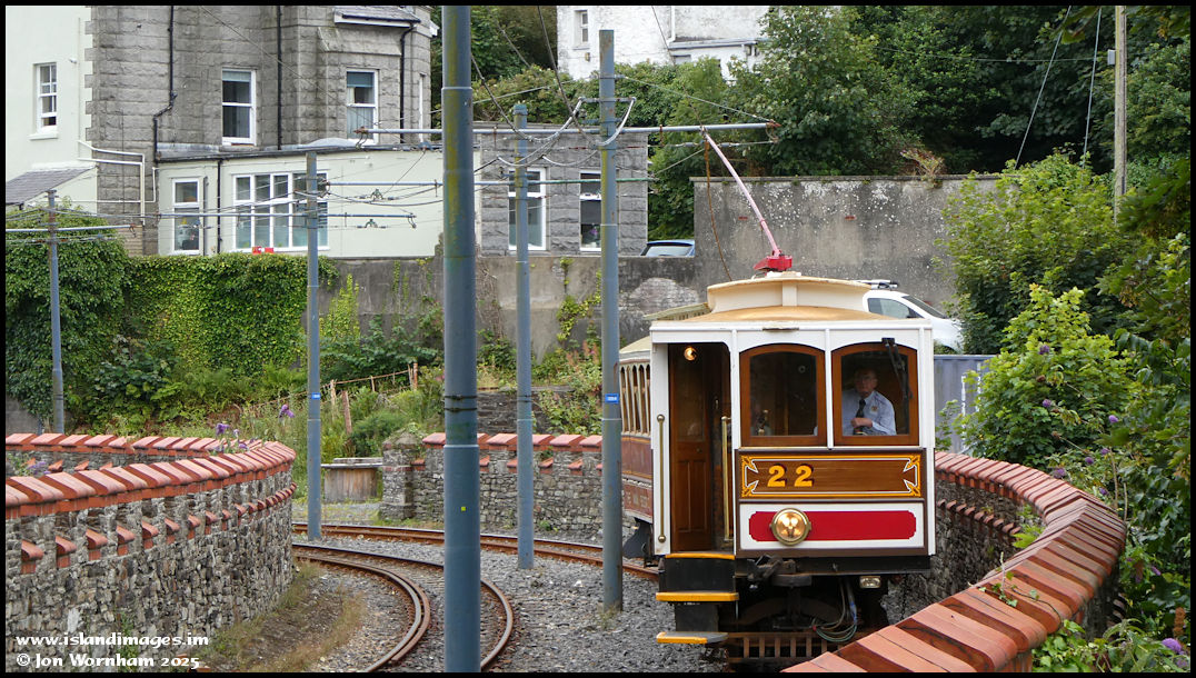 Car No 22 and one of the saloon trailers crossing the ornate viaduct before entering the station.