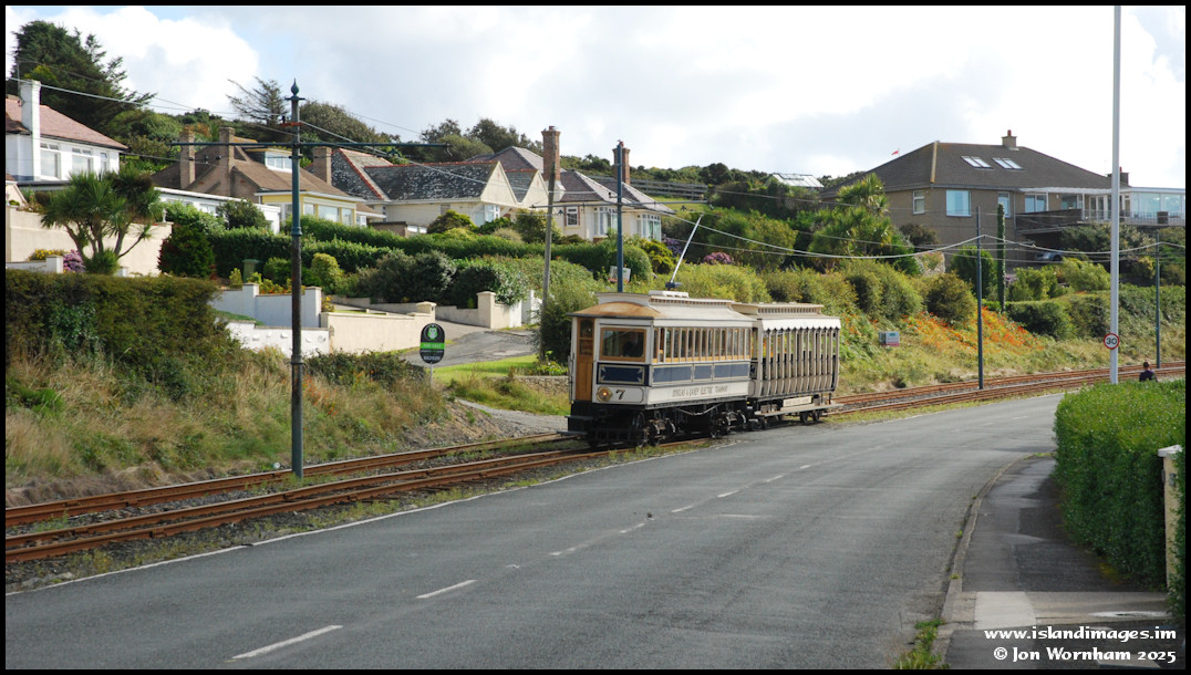 I was on King Edward Road in Onchan on the 25th August 2011 to capture Manx Electric Railway Car No 7 trundling alongside the road heading down to Derby Castle.