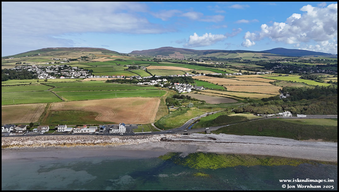Turning the camera to look inland past the Shore Hotel. The little settlement centre is Croit-e-Caley with Ballagawne/Ballakillowey to the left.