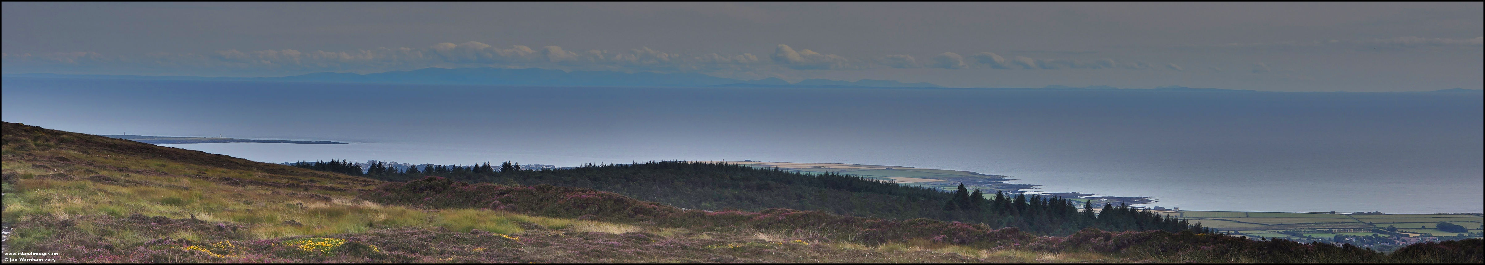 A stitched panorama from four phone pictures from Slieau Earystane showing the North Wales mountains on the horizon
