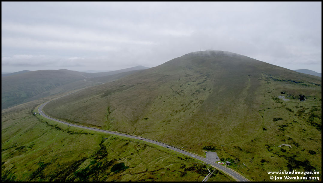 I had to drop the drone altitude down a couple of times when the low clouds drifted towards me and this is one of those, looking south along the Mountain Road from Black Hut towards Bungalow, with the radio masts on Snaefell hiiden by clouds.
