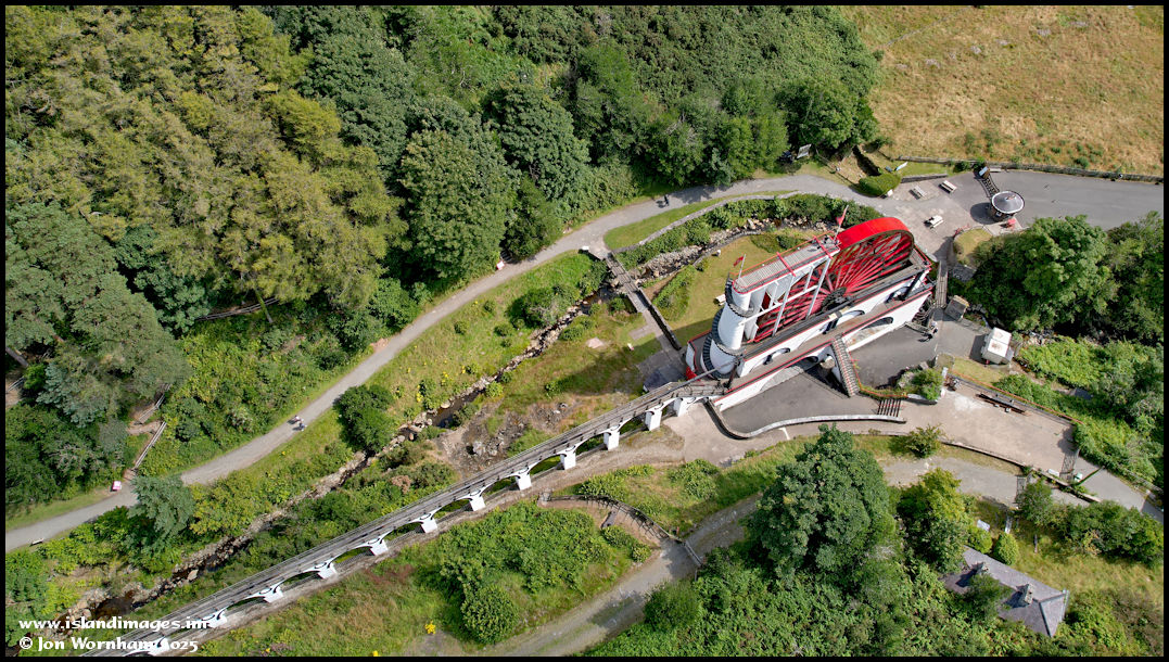 An almost vertical view looking down on the Laxey Wheel, with a couple of people on the viewing platform at the top. The circular motion of the wheel is converted into a linear form and transmitted to the pumps by a long drive shaft on the viaduct.