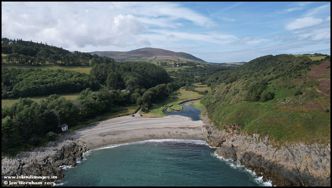 Flying out over the sea to look back at the Port Cornaa beach and lagoon, with North Barrule in the distance. The river rises in the valley to the south of the mountain.