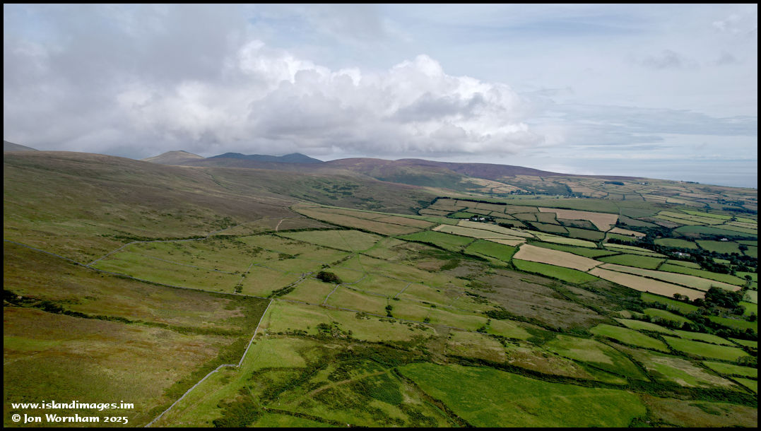Now on the east side of Windy Corner and looking across the farmland spreading up from Glen Roy. Clagh Ouyr and North Barrule in the distance.