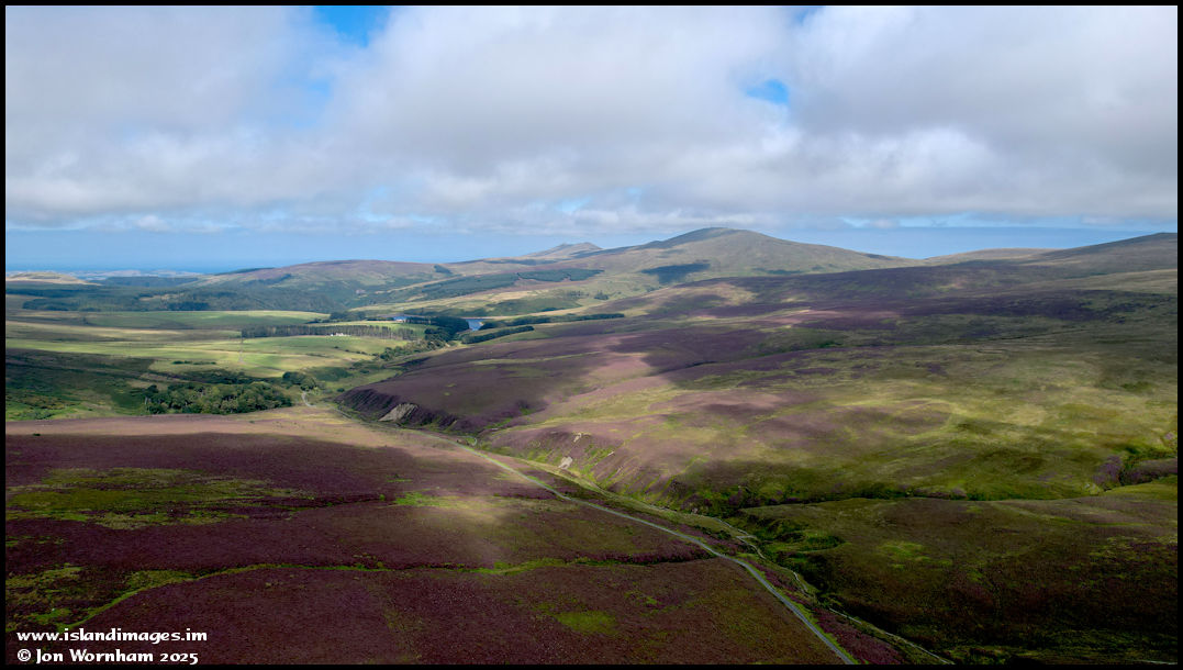 Flying up the lower slopes of Sartfell and looking back across the moorland towards Snaefell.