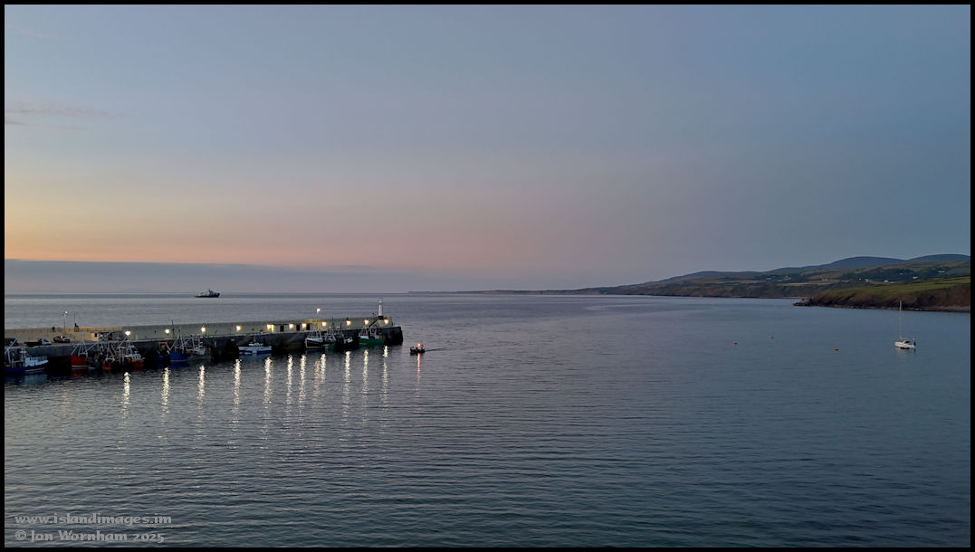 Dusk over Peel Bay as a small fishing boat rounds the breakwater. The larger vessel offshore is the Northern Lighthouse Board's 'Pharos', currently working on lighthouses around the island.