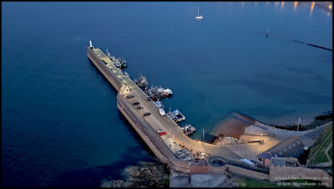 Looking down on the breakwater with a good number of fishing vessels tied up alongside.
