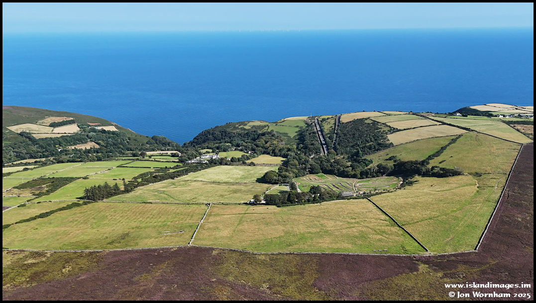 This view is looking down towards the Dhoon Glen, although most of the gen is hidden behind terrain. Over to the right you can see the Manx Electric Railway and coast road climbing up, with the Ballaragh Road splitting off to the right.