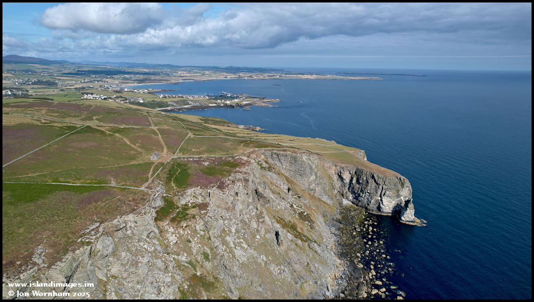 The view in the opposite direction to the last one, past the Sugarloaf Rock and with Port St Mary in the distance. The shadow in the distance is Langness.