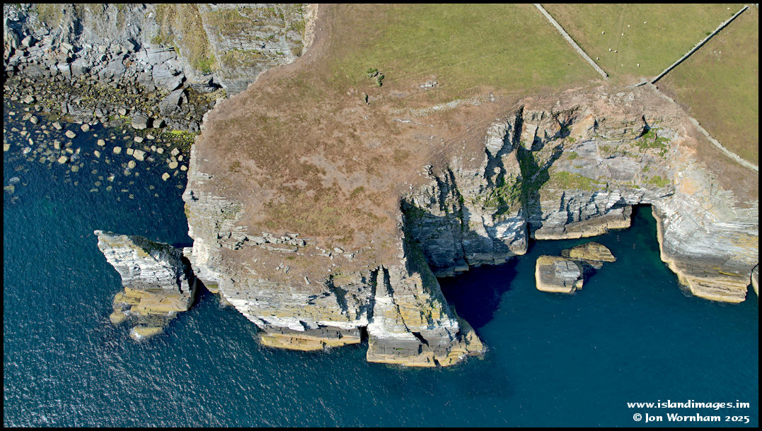 A near vertical view looking down to The Sugarloaf and The Anvil. Interesting to see from this angle that there is another 'pinnacle' shaped rock, but almost encased in the headland.