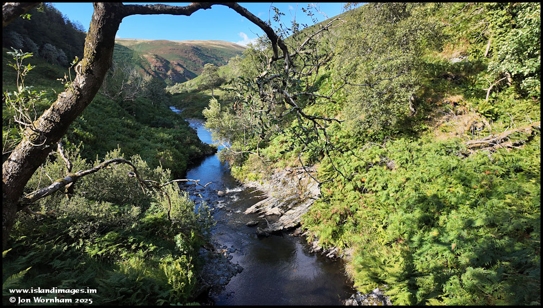 This is the view looking upstream from the old stone bridge that once provided access to the farmstead of Ballaskella, via a