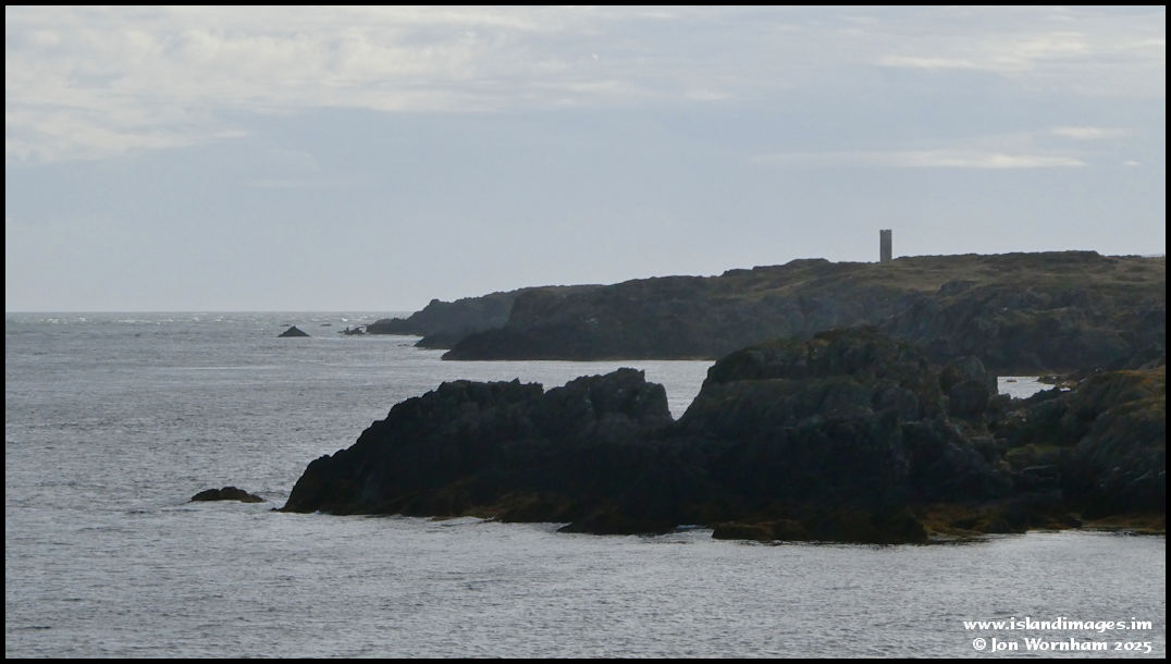 Looking 'into sun' along the rocky south coast of the Langness Peninsula. The structure is the Herring Tower, constructed in the 1800s as a landmark for ship and boats.