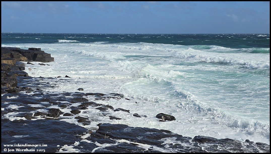 White water on the limestone rocks at Kallow Point. Dreswick Point Lighthouse on Langness is just visible towards the top left corner.