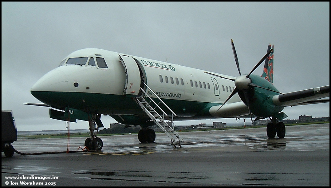 When the island had its own airline. On the 17th of September 2000, British Aerospace ATP G-MANA awaits its next trip on a wet west apron at Ronaldsway.