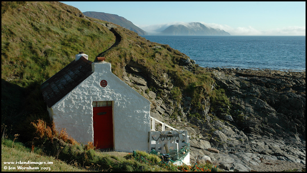 The tiny Knockuskey Cottage at Niarbyl, with sea fog drifting over Bradda in the distance. Photo taken on the 6th of September 2005.