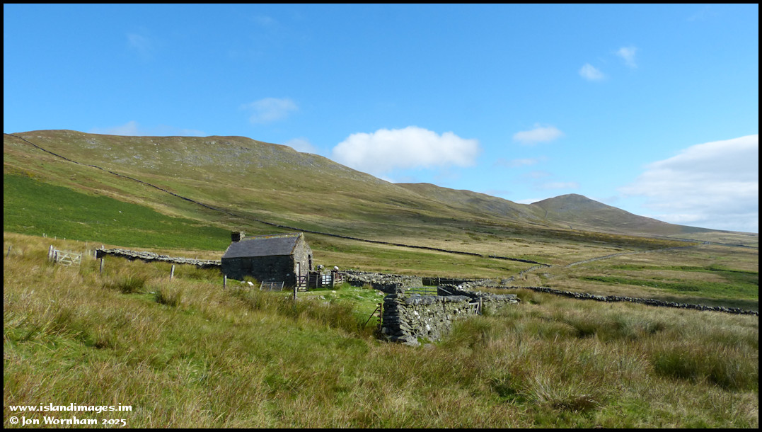 The isolated shepherd's hut and sheepfolds in the upper Cornaa Valley with the North Barrule ridgeline as backrop. Picture taken on the 3rd of September 2013.