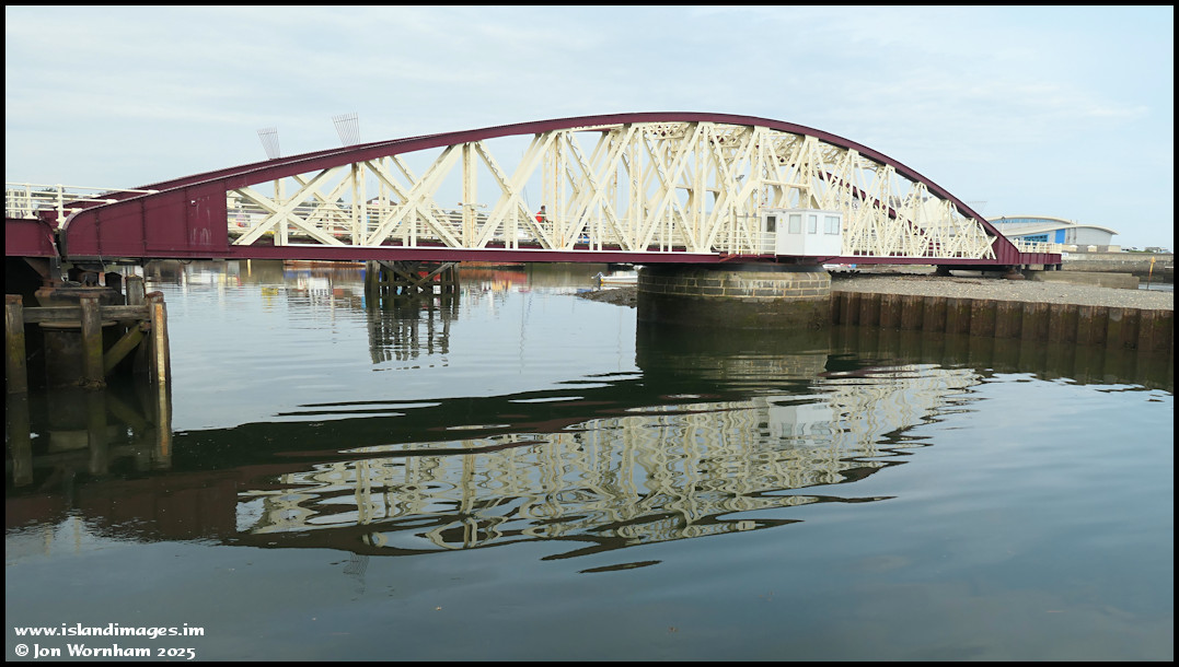 The Ramsey Swing Bridge reflected in a calm harbour on the 15th of September 2000. The bridge was originally constructed in 1892 and carries both vehicles (one way only) and pedestrians and is the lowest crossing point on the Sulby River.