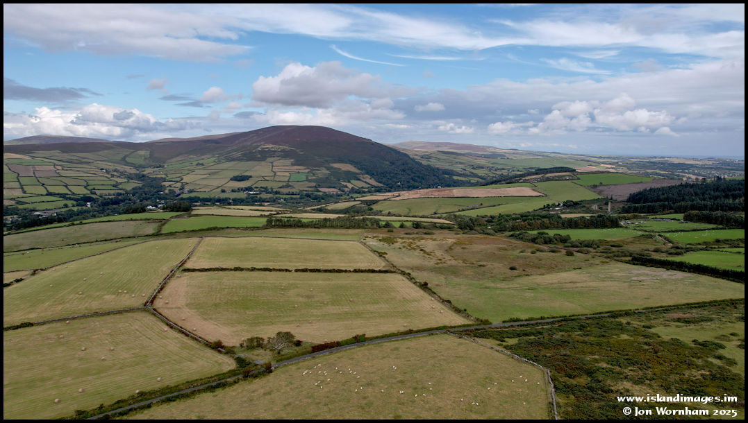 Turning the camera away from Foxdale for this view across the upland fields and across the central valley to Greeba Mountain. Over to the right you can see the edge of Archallagan Plantation and the chimney of Cornelly Mine.