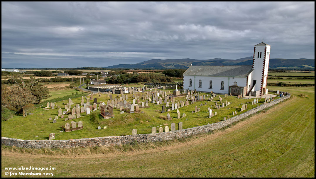 Dropping down to a low level to show the mound in the old section of the graveyard. Although never excavated (due to the more recent graves on top), it is thought to be a pre-Christian Viking burial site.