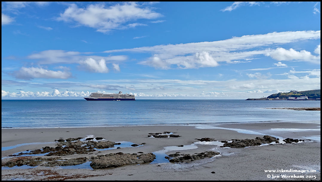 Viewed from the beach, the huge cruise ship 'Nieuw Statendam' at anchor in the bay.