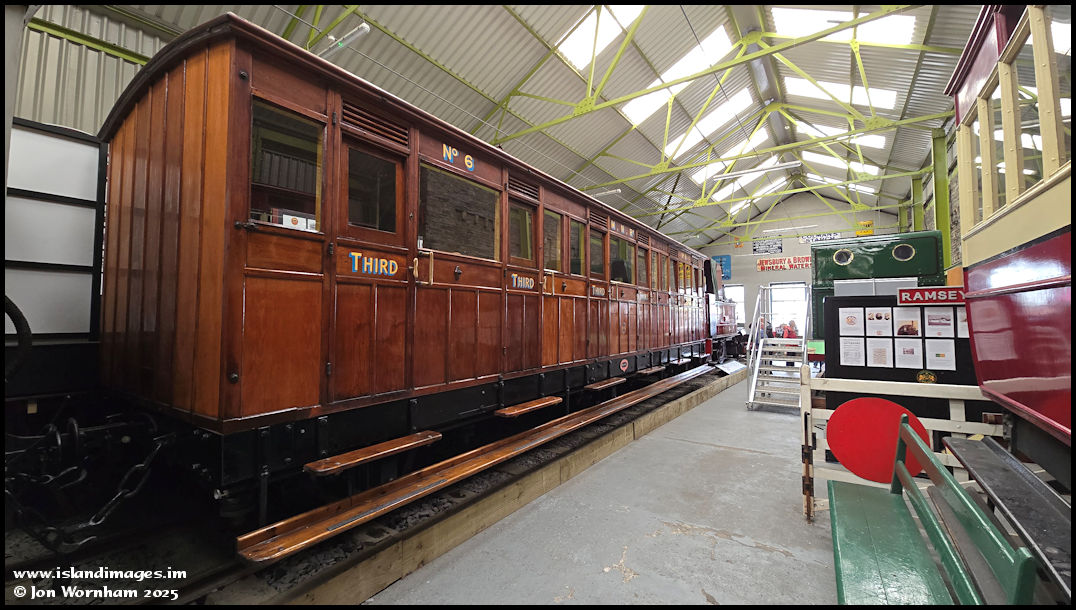Immaculately restored Manx Northern Railway six wheeled 'Cleminson' in varnished teak livery. This vehicle is privately owned but on loan to the railway and capable of main line running.