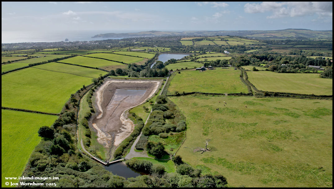 Turning the camera back around to show both reservoirs. In the field to the right are some of the horses from the Douglas Bay Horse Tramway.