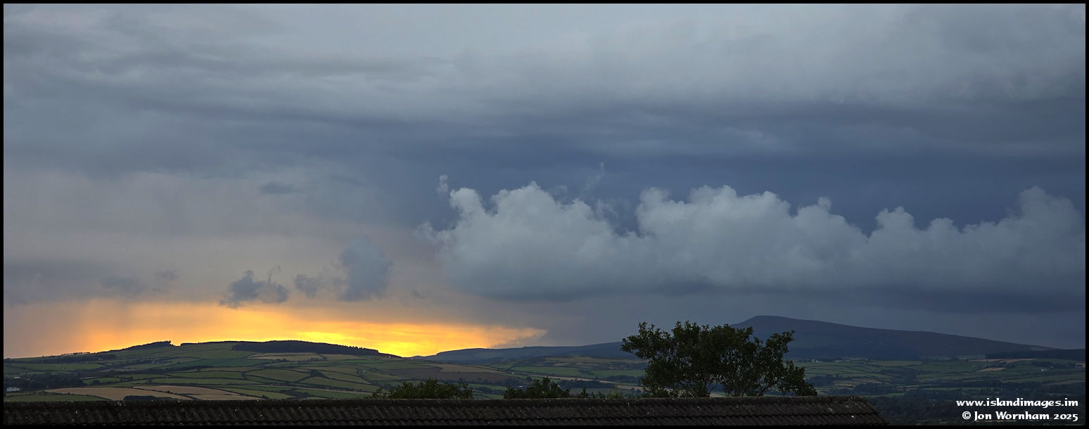 As sunset approaches on the following day, a heavy rainshower is crossing the island from the west, leaving a band of gold over Chibbanagh Plantation, Braaid.