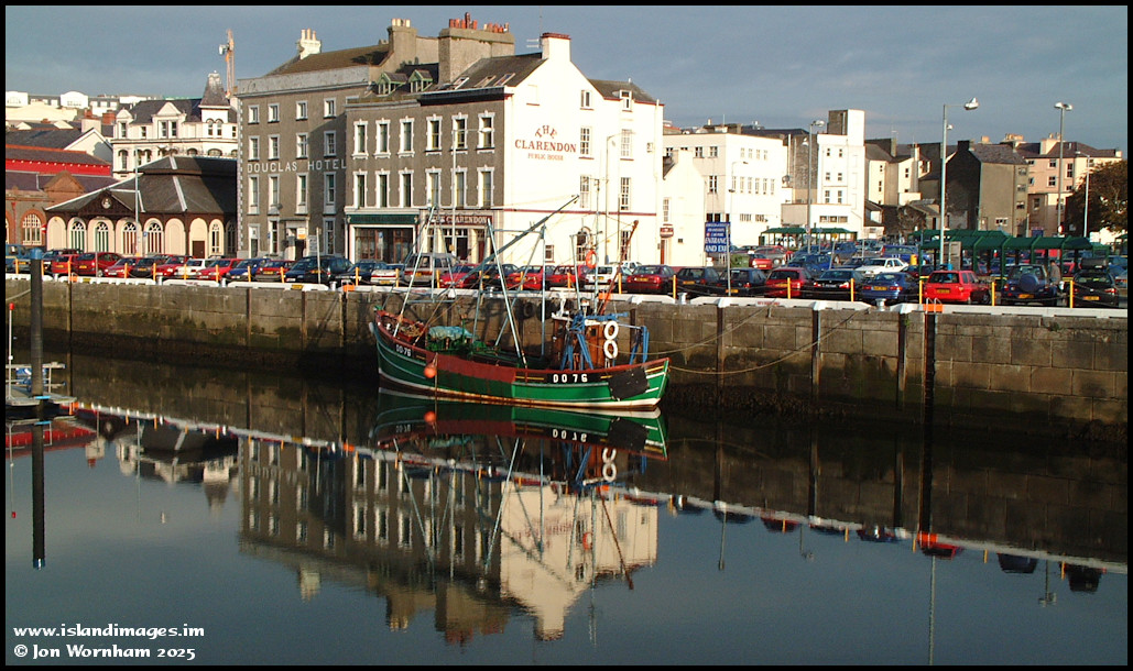 Reflections on Douglas inner harbour on the 1st of October 2002. The two buildings behind the fishing boat have since been demolished and replaced.