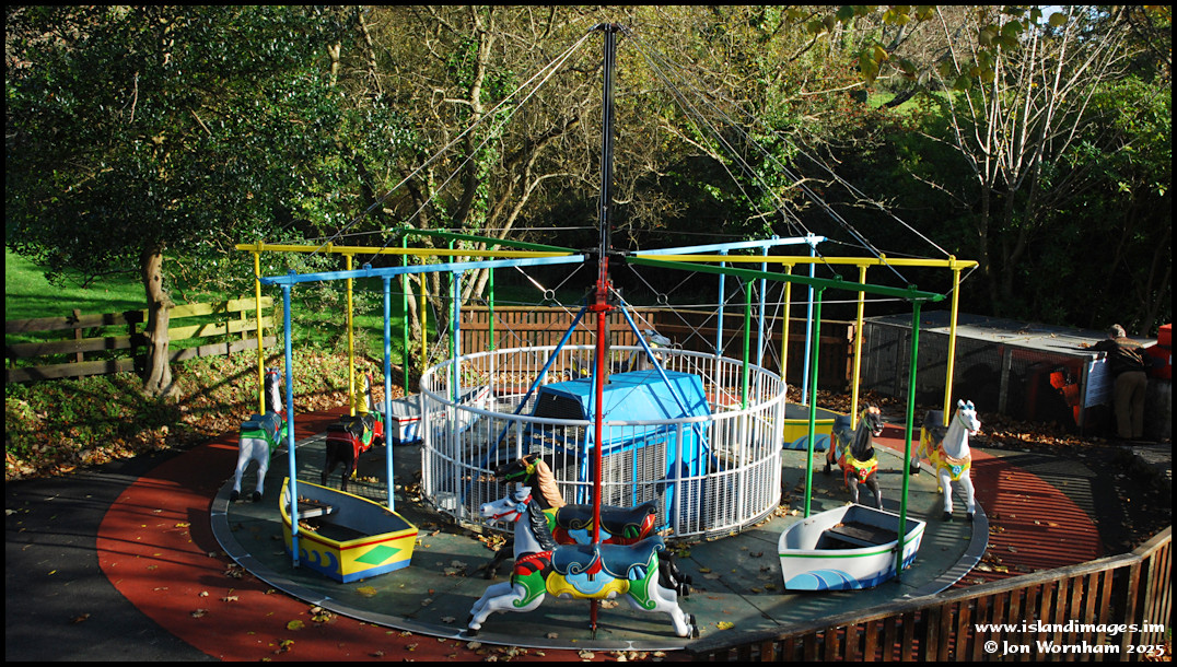 The water powered childrens roundabout in Silverdale Glen on the 31st of October 2008. The man in the background is standing by the waterwheel that powers it, when operated by a lever.