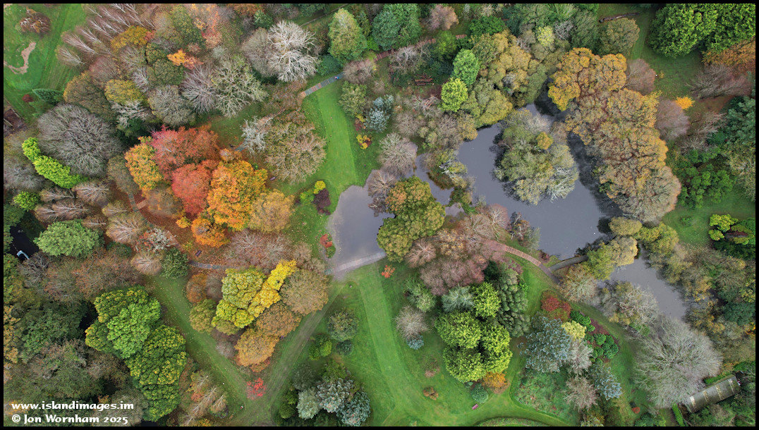 Some lovely Autumn colours in this vertical drone shot at the National Park Arboretum at St John's on the 28th of October 2024. The small 'lake' at centre is actually a grassy area where the main lake (right) floods after heavy rains.