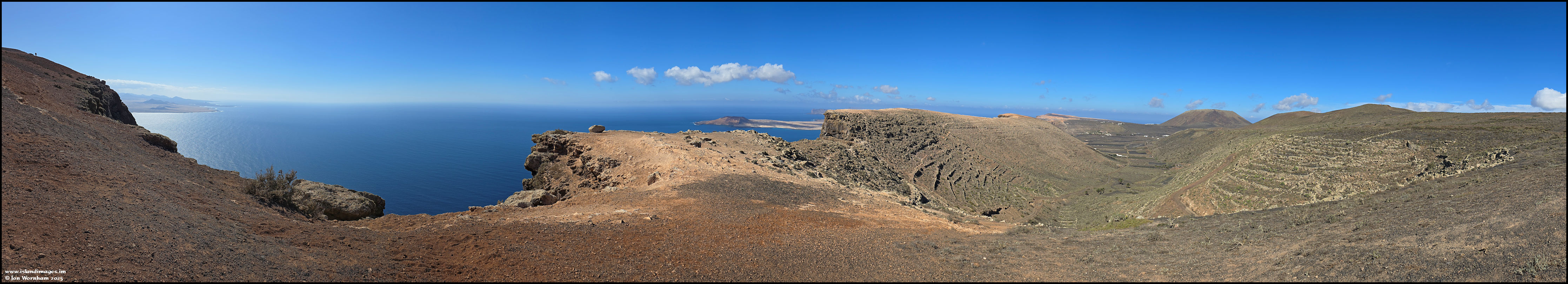 A panorama from the Famara Cliffs, with Graciosa island just peeking out from behind, the the Guinate Valley dropping down on the right.