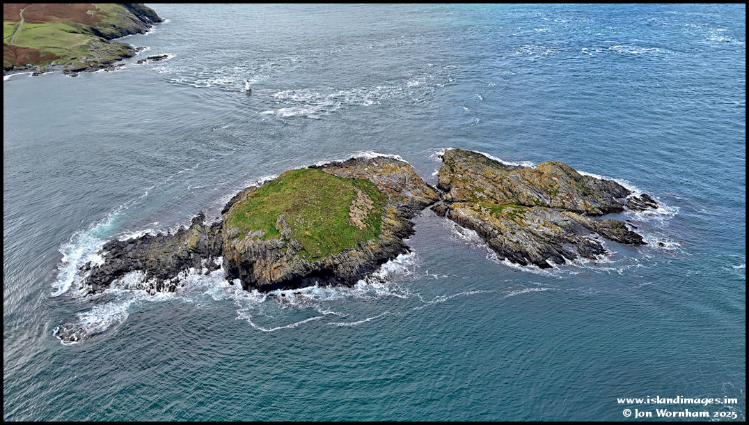 Kitterland at high tide, with the Thousla Rock behind it completely covered with only its lighthouse visible.