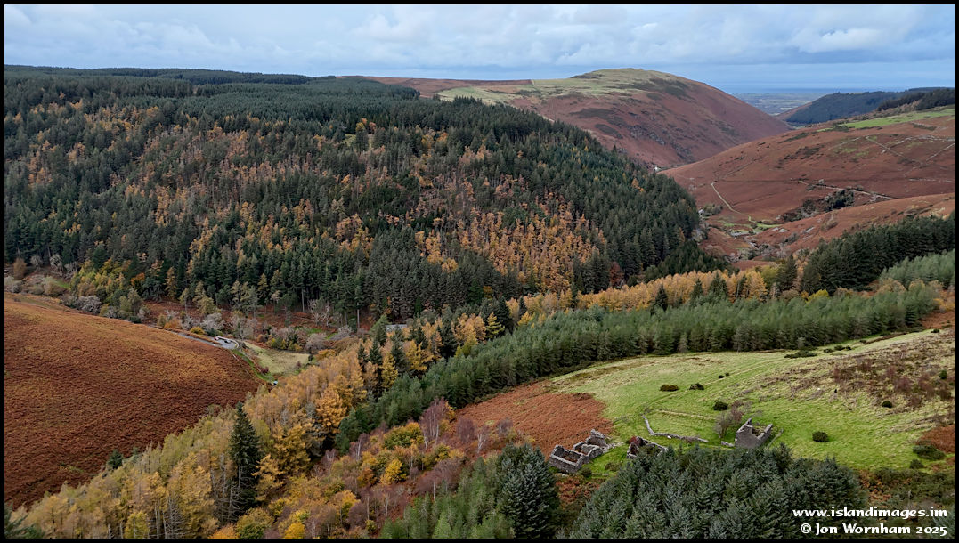 Some lovely autumn colours looking across the tholtan of Tholt-y-Will farm and along Sulby Glen. The dull orange colour on a lot of the hillsides is where this year's growth of bracken has died off.