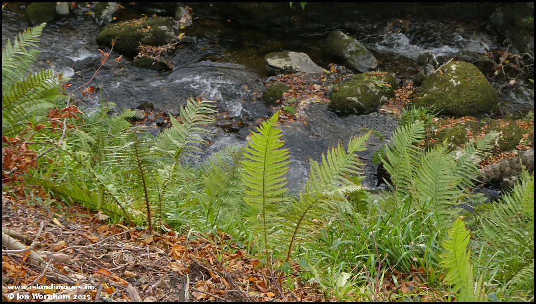Climbing back up the path to the road and looking back down to the river through ferns.