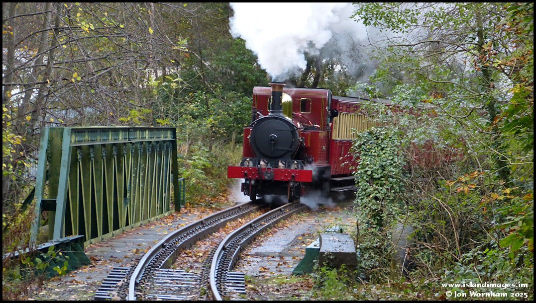Isle of Man Railway No 13 'Kissack' is about to cross the Douglas River by The Nunnery on a late season train to Port Erin on the 1st of November 2012.