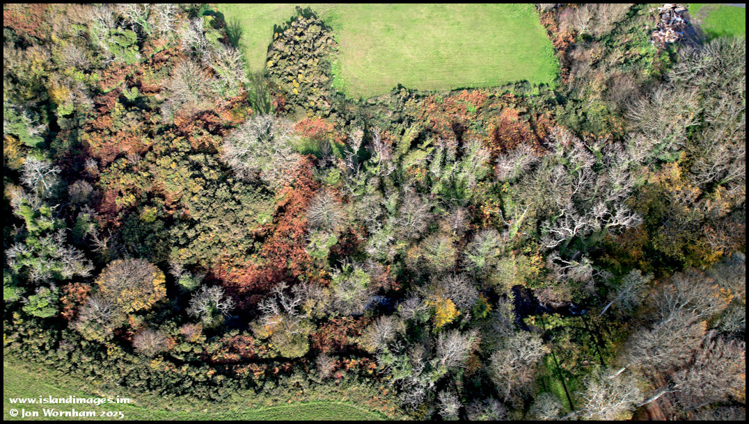 Looking straight down on the section of the glen containing the waterfalls, although they are hidden by the trees from this angle.
