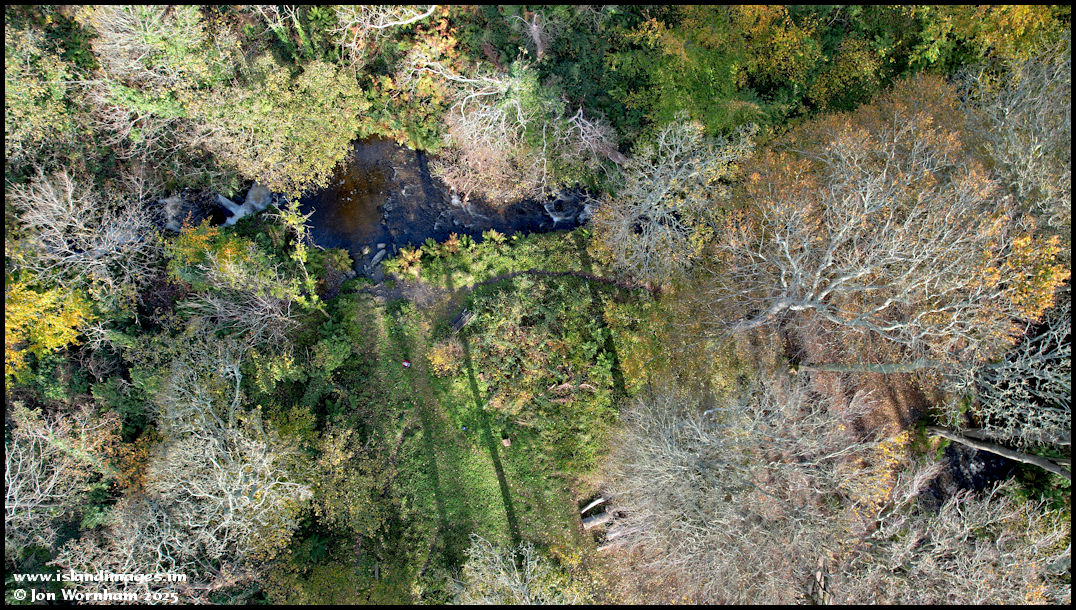 Looking down to the smaller clearing where I was flying from, with the Fairy Pool and lower waterfall visible.