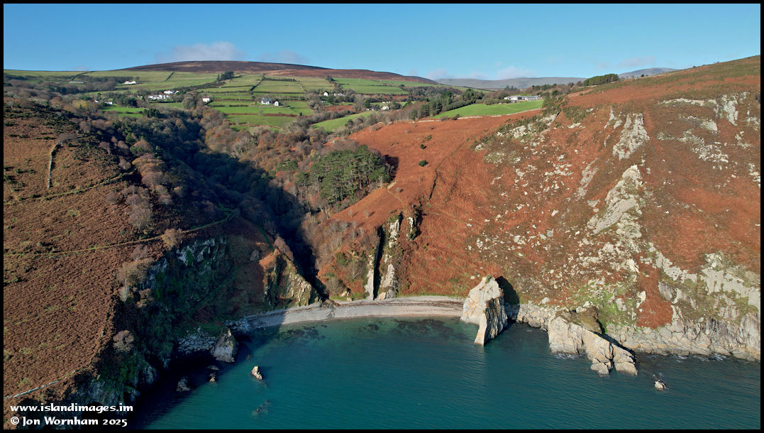 Flying out over the sea for a look back at the beach and glen running up behind it.