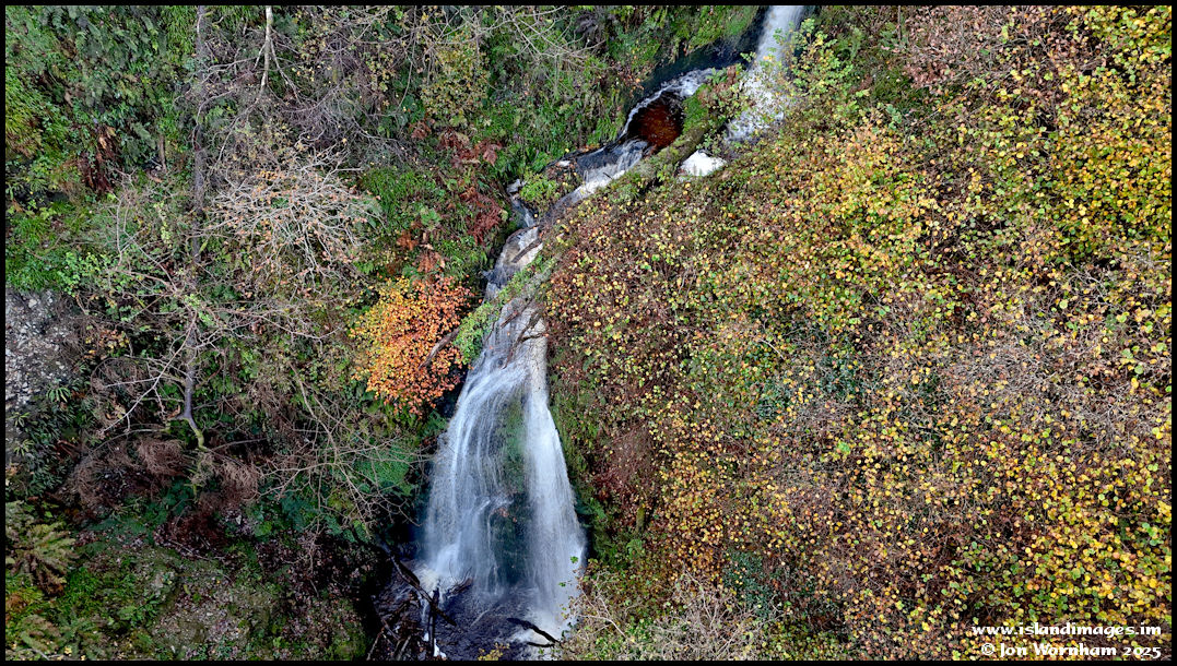 The mid and lower sections of the waterfall.  At some time a whole tree has fallen and become lodged by the pool between the two sections and although the tree is dead is seems to be hosting many ferns!