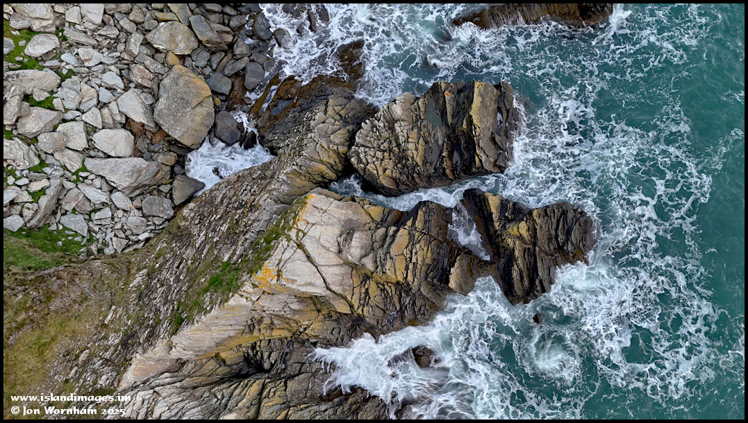 Waves wash around the rocks to the north of 'The Dragon'.
