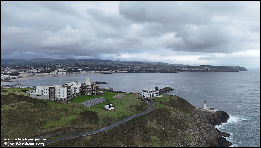 Flying out over the cliffs and the Douglas Head Lighthouse has come into view.