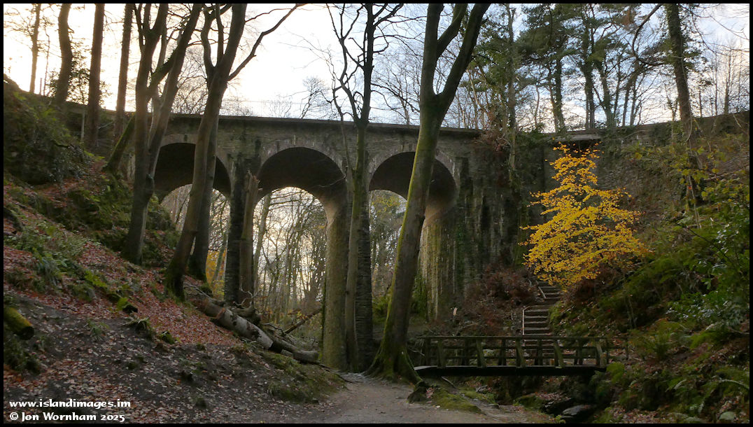 The stone viaduct over the glen, constructed in 1894 to allow the Manx Electric Railway to continue from Groudle to Laxey. Road and railway share it on a tight bend.